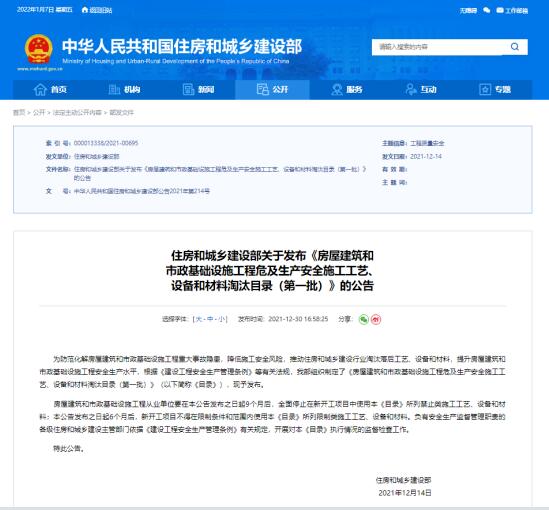 為防范化解房屋建筑和市政基礎(chǔ)設(shè)施工程重大事故隱患,降低施工安全風(fēng)險(xiǎn),推動(dòng)住房和城鄉(xiāng)建設(shè)行業(yè)淘汰落后工藝、設(shè)備和材料,提升房屋建筑和市政基礎(chǔ)設(shè)施工程安全生產(chǎn)水平,根據(jù)《建設(shè)工程安全生產(chǎn)管理?xiàng)l例》等有關(guān)法規(guī),我部組織制定了《房屋建筑和市政基礎(chǔ)設(shè)施工程危及生產(chǎn)安全施工工藝、設(shè)備和材料淘汰目錄(第一批)》(以下簡(jiǎn)稱《目錄》),現(xiàn)予發(fā)布。